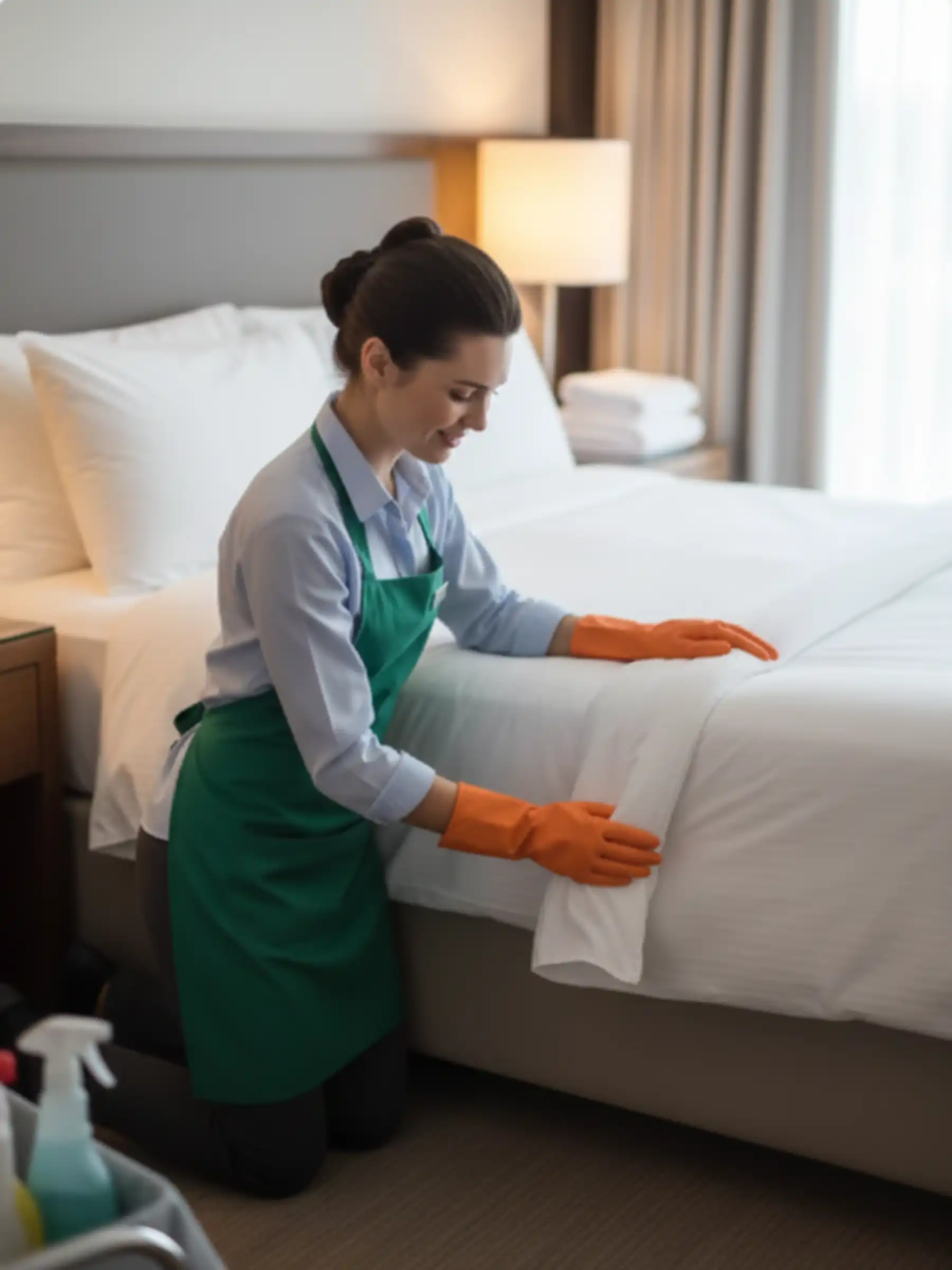 Als erfahrener Partner für professionelle Hotelreinigung verstehen wir die kritischen Momente im Hotelalltag. Wir agieren als Ihre geräuschlose Stütze im Hintergrund und gewährleisten, dass jedes Zimmer pünktlich zum Check-in makellos bereitsteht.So schaffen Sie wertvolle Freiräume für Ihr Management und garantieren Ihren Gästen einen perfekten Aufenthalt, ohne sich um Personalengpässe sorgen zu müssen. Wir unterstützen Sie bei: